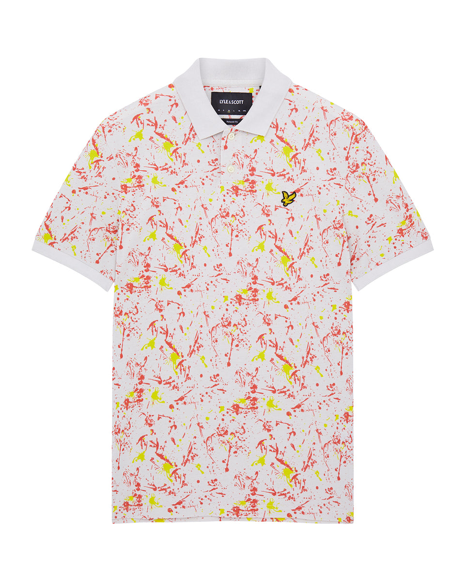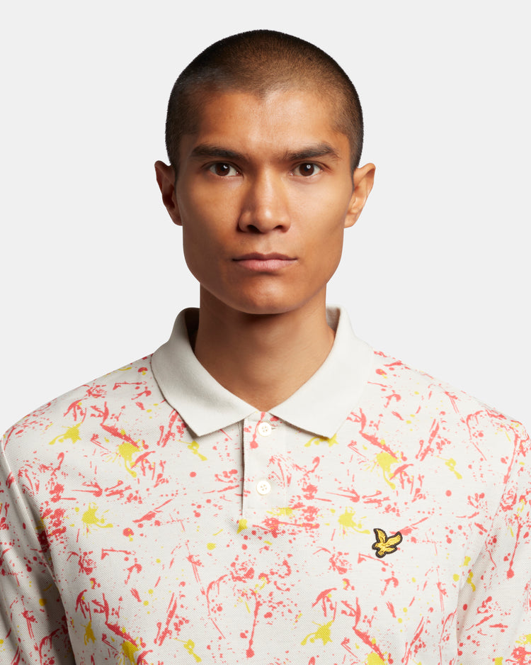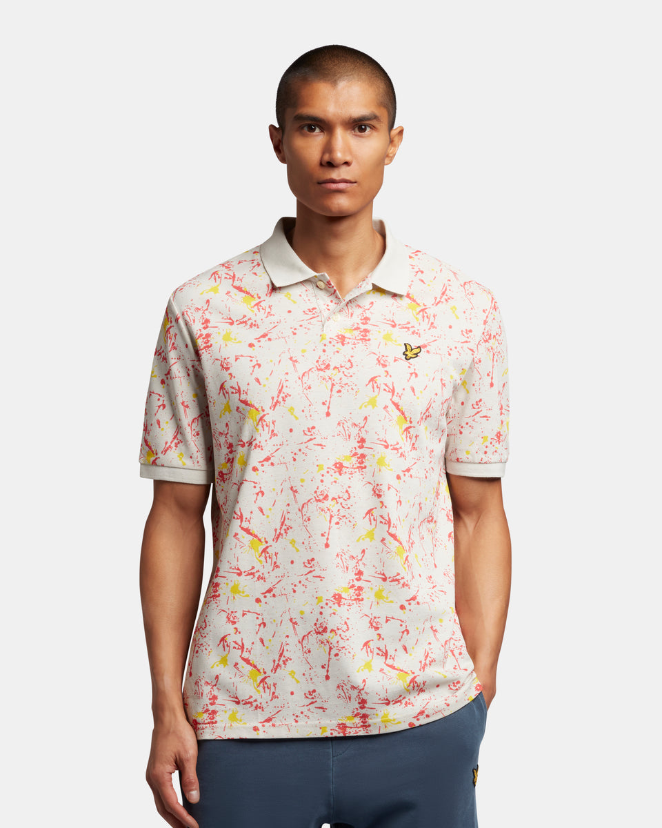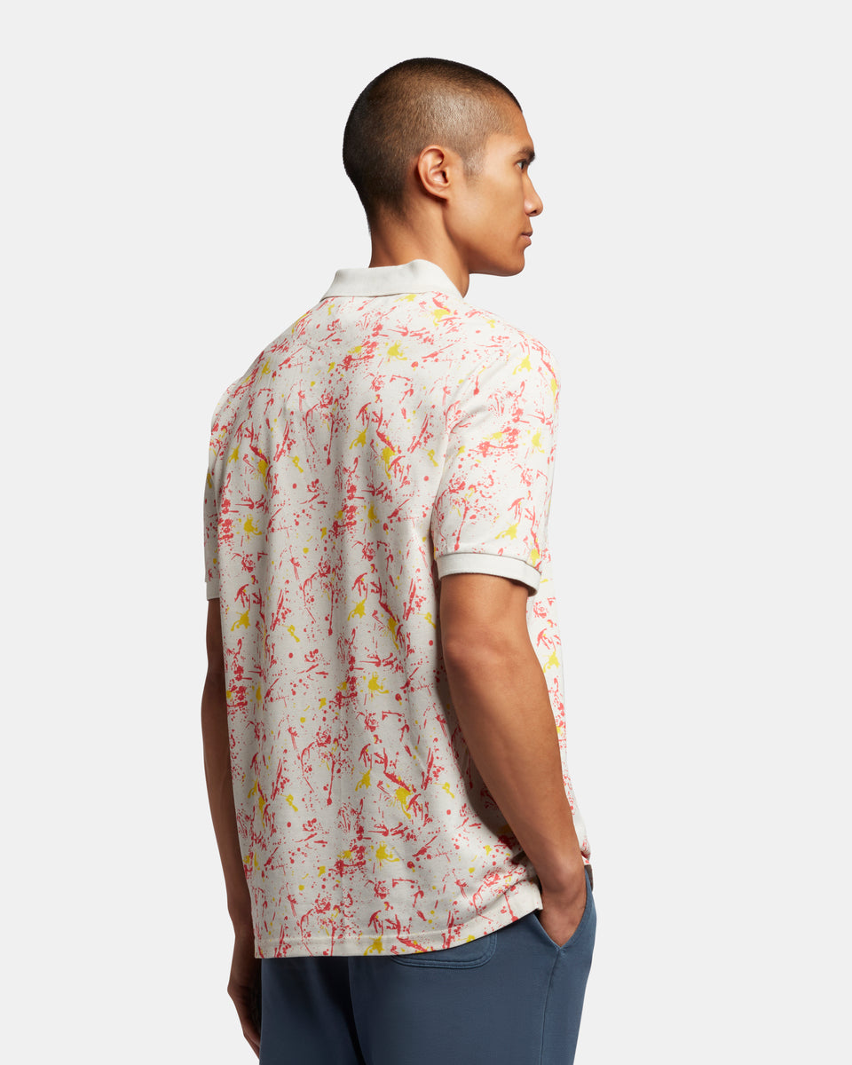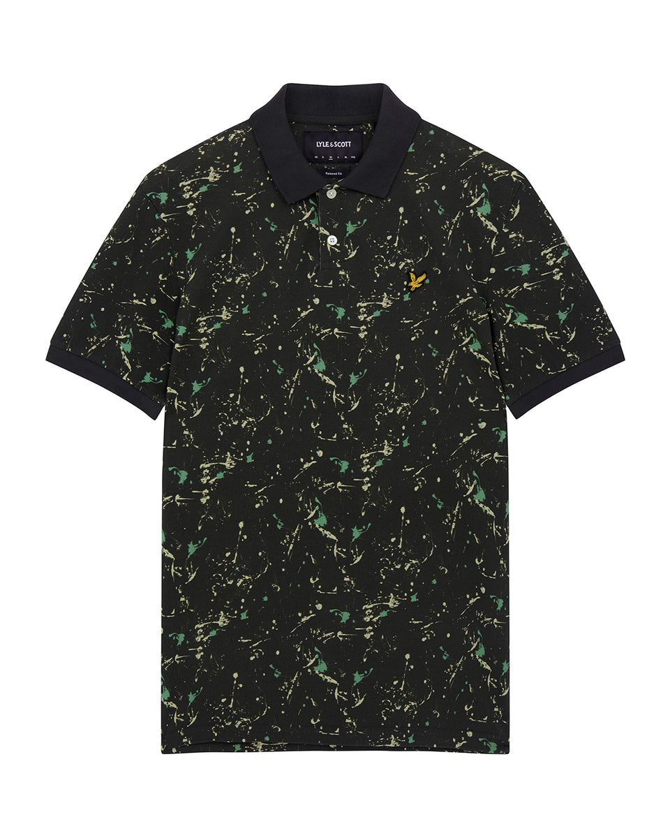 スプラッタープリント加工を施したポロシャツは襟と袖に無地のリブを採用。軽装シーズンの単調なスタイルに変化をもたらしてくれます。