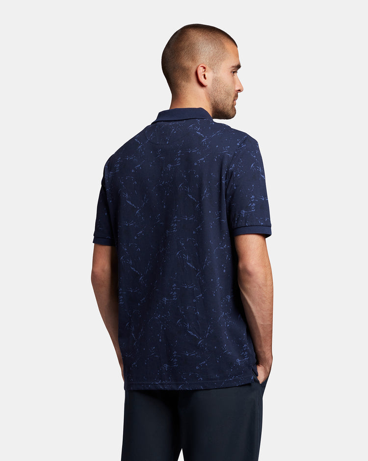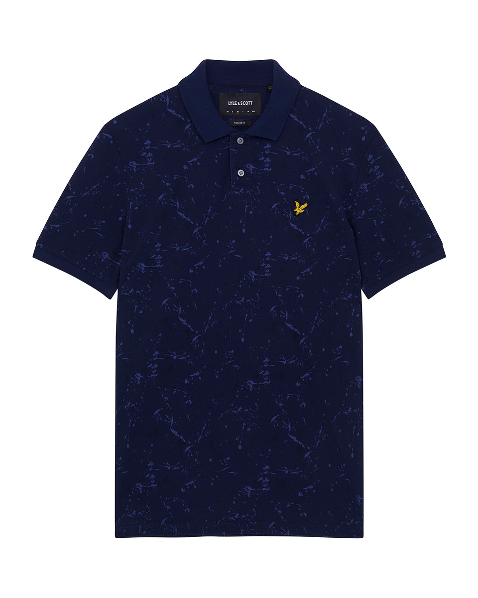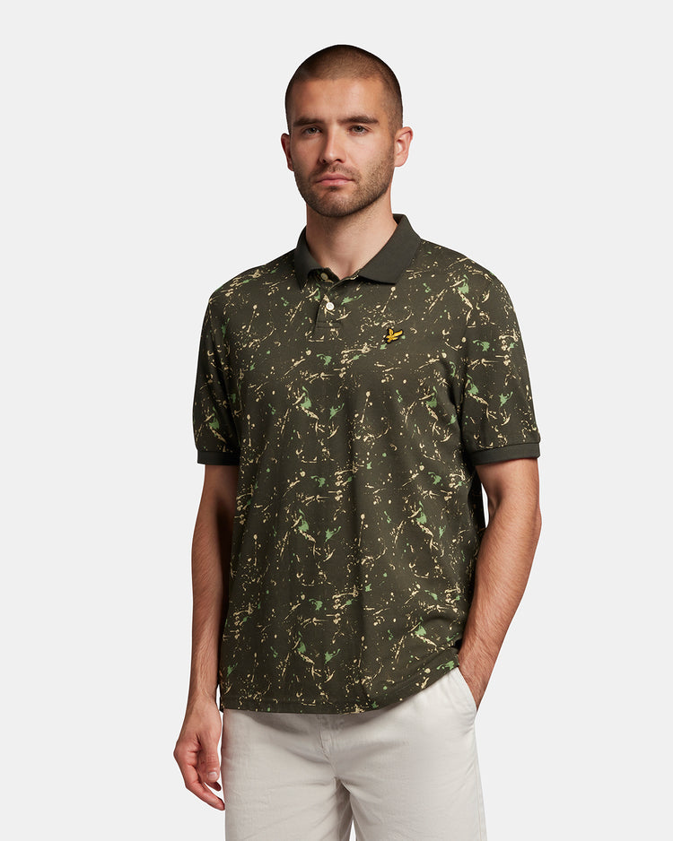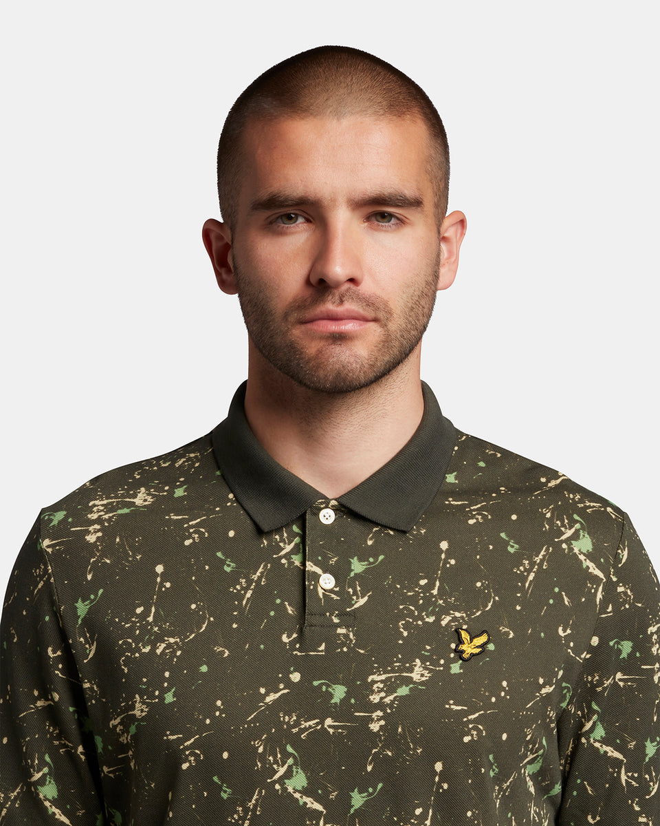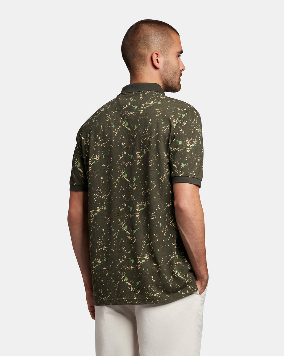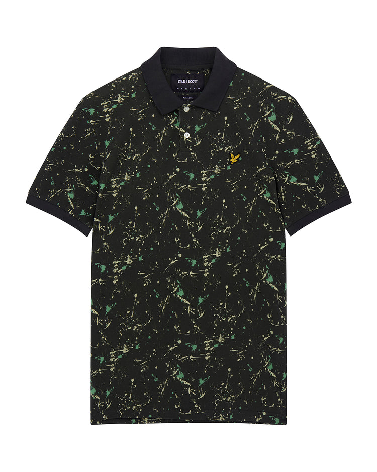 スプラッタープリント加工を施したポロシャツは襟と袖に無地のリブを採用。軽装シーズンの単調なスタイルに変化をもたらしてくれます。